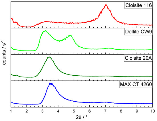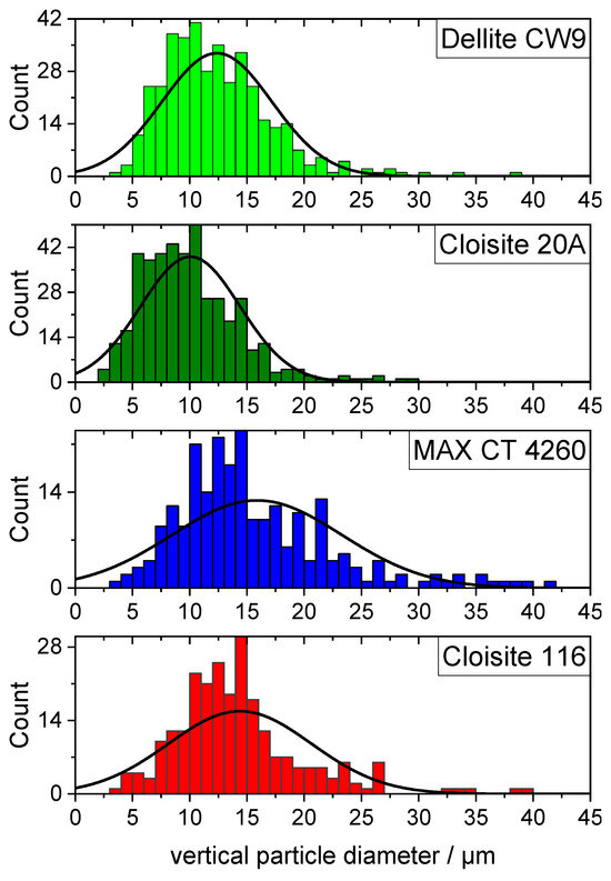 Using ImageSP Viewer, the diameters of every particle were measured vertically since they did not have a uniform shape that would dictate a default measurement direction. No preferred alignment was induced by the sample preparation, allowing for any consistent direction to be representative. The respective histograms of the particle size distributions are displayed in Figure 3, and additional data are compiled in Table 2. Cloisite 20A had the smallest particles overall, as well as a decently narrow distribution. The maximum of the particle size distribution at 10.02 µm was, indeed, well below every other examined bentonite, followed by Dellite CW9 at 12.38 µm, the unmodified Cloisite 116 at 14.45 µm, and, lastly, the largest average particle size in MAX CT 4260 at 15.88 µm. The full width at half maximum of the particle size distributions confirmed the narrowest distribution for Cloisite 20A, whereas MAX CT 4260 had the widest distribution. Judging from these data, Cloisite 20A should give rise to the best dispersion in a composite, given that the compounding process can achieve such a level of dispersion. The high amount of organic modifier inside the galleries of Cloisite 20A facilitates the formation of the largest interface and should potentially destabilize the composite the most.