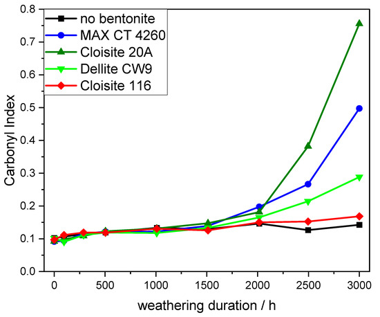 To contextualize these findings with the actual stability of the resulting composites, the degradation of dumbbell-shaped samples during artificial weathering was monitored by ATR-IR-spectroscopy (the spectra can be found in the Supplementary Data) using the carbonyl index (CI) as an indicator (Figure 6). Up to a weathering duration of 1500 h, the polymer oxidation on the sample surface showed no difference for the model compounds. From this point on, a clear divergence was evident between the OLS composites on the one hand and the bentonite-free as well as the unmodified bentonite-containing formulation on the other hand. The latter group did not exhibit significant oxidation in the period of observation, whereas the former depicted an exponentially increasing degree of oxidation. The three OLSs substantially differed from each other in terms of their rates of degradation. Cloisite 20A led to the strongest oxidation and Dellite CW9 only showed minor oxidative progress. All the previously analyzed data for Cloisite 20A implicated a fast degradation of the respective composite. The data concerning Dellite CW9, however, suggested a less severe impact on compound stability, most likely due to its smaller pores and smaller specific surface area along with shorter interlayer distances.