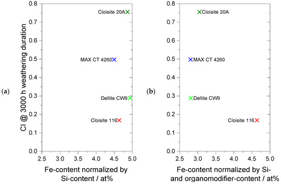 Iron content obtained by SEM-EDX analysis, normalized by (a) Si content and (b) Si content and organo-modifier content obtained by TGA, each with corresponding CI and the end of weathering.