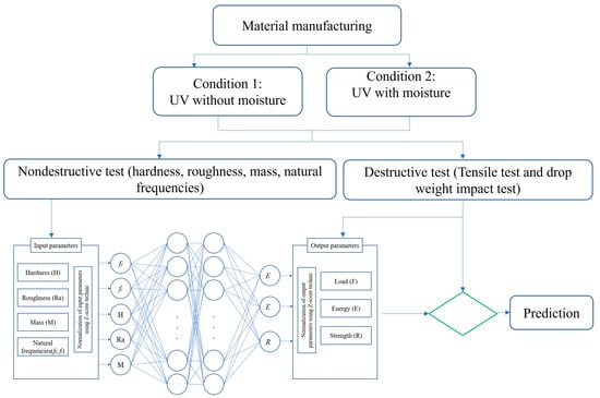 This section summarizes the approach adopted to predict the long-term mechanical properties and low-velocity impact properties of the PP30-F and PP30-P biocomposites subjected to accelerated weathering. The collected data were used to develop an ANN model. Two aging conditions were used in this study: aging by UV rays with or without moisture. The input parameters of the model were the mass (M), hardness (H), mean roughness (Ra), and natural frequencies (bending and torsion modes, respectively, fb and ft), and the output parameters were the maximum impact load and absorbed energy. After the ANN model was validated, such models were used to predict the tensile strength (R) and the impact performance (F and E). Figure 1 presents the methodology of this study.