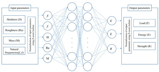 A database was constructed on the basis of the experimental results. It included 70 sets of data used to validate the ANN model for predicting the impact performance (maximum load, absorbed energy, and tensile strength, that is, F, E, and R, respectively) of the biocomposites. Initially, six input parameters were selected: the hardness (H), mean roughness (Ra), and natural frequencies (torsion and bending modal, i.e., ft and fb, respectively).