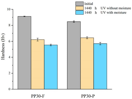 Prior to aging, the PP30-F biocomposites exhibited higher hardness than the PP30-P biocomposites; the corresponding hardness values were H = 9.12 and 8.72 HRC, respectively. After aging, a reduction in the hardness was observed for both materials, as shown in Figure 3. However, after 1440 h of UV exposure under dry conditions, the measured hardness of the PP30-F biocomposite was 6.21 HRC, while that of the PP30-P biocomposite was 6.44 HRC. Similarly, under humid conditions, the corresponding values were 5.54 and 5.71 HRC, respectively. This reduction is mainly attributed to the scission of the polymer chains, which led to the formation of surface cracks and embrittlement of the material. The number of chain scissions increased with the exposure time, resulting in shorter polymer chains and degradation of all the mechanical properties. PP30-P exhibited a smaller hardness loss than PP30-F, which can be explained by the antioxidant effect of the lignin in pine fibers [29].