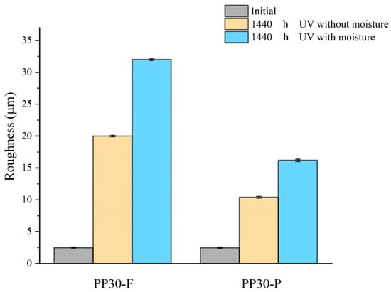 Average roughness of unaged and aged PP30-F and PP30-P biocomposites after 1440 h of exposure.