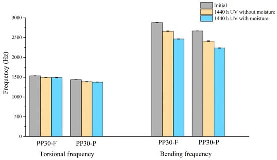 Figure 5 shows the natural frequencies of the unaged and aged biocomposite samples at 1440 h. The results indicate reductions in the natural frequencies. The UV irradiation reduced the resonant frequencies of the composites by degrading the polymer materials in both the matrix and the reinforcing fibers. In the case of UV aging combined with moisture, the resonant-frequency reduction was accelerated. Photo-oxidation causes the splitting of the polymer chains of the thermoplastic matrix, resulting in surface microcracks. When composites are exposed to moisture, water can be absorbed by natural fibers or by the interfaces between the fibers and matrix. This water absorption causes swelling of the fibers and matrix, which affects the fiber–matrix adhesion and the mechanical properties of the composite, reducing the resonant frequency.