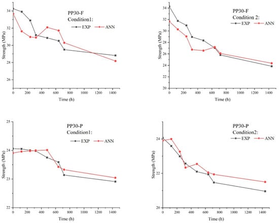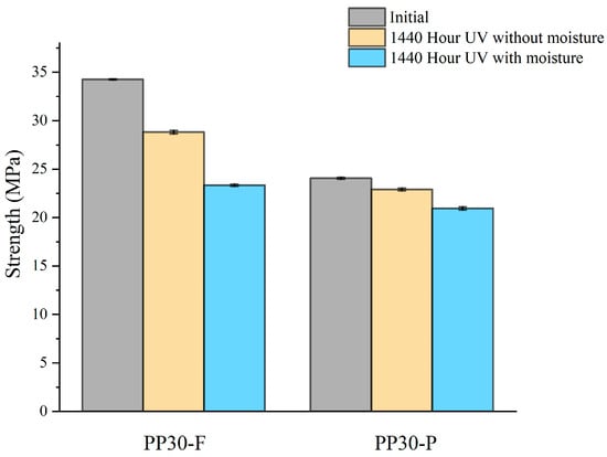 Strength of unaged and aged PP30-F and PP30-P biocomposites after 1440 h of exposure.