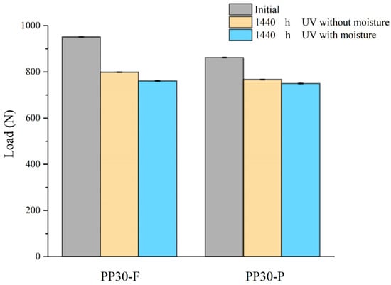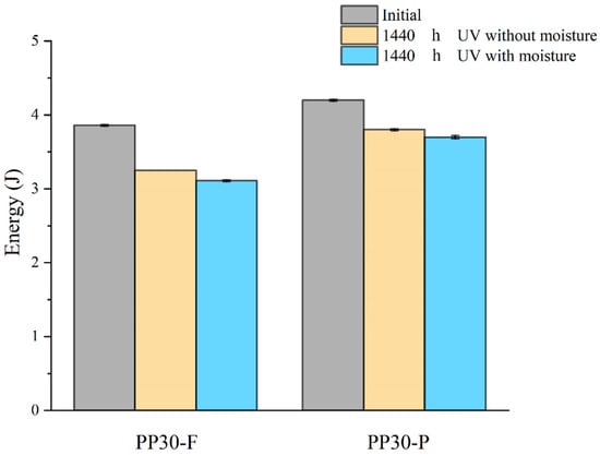 Prior to aging, the PP30-F biocomposites exhibited higher strength than the PP30-P biocomposites, with a maximum load (F) of 951.72 N and energy absorption (E) of 3.86 J, compared with a maximum load of 862.28 N and energy absorption of 4.21 J for PP30-P. However, after aging, the PP30-F biocomposites exhibited more significant degradation in both properties. After 1440 h of exposure, the PP30-F biocomposites exhibited a maximum load of 798.84 N and energy absorption of 3.25 J in the first condition (UV without moisture) and a maximum load of 867.18 N and energy absorption of 3.78 J in the second condition (UV with moisture). Meanwhile, the PP30-P biocomposites exhibited a maximum load of 760.82 N and energy absorption of 3.11 J in the first condition and a maximum load of 749.94 N and energy absorption of 3.68 J in the second condition.