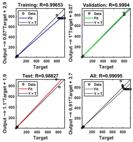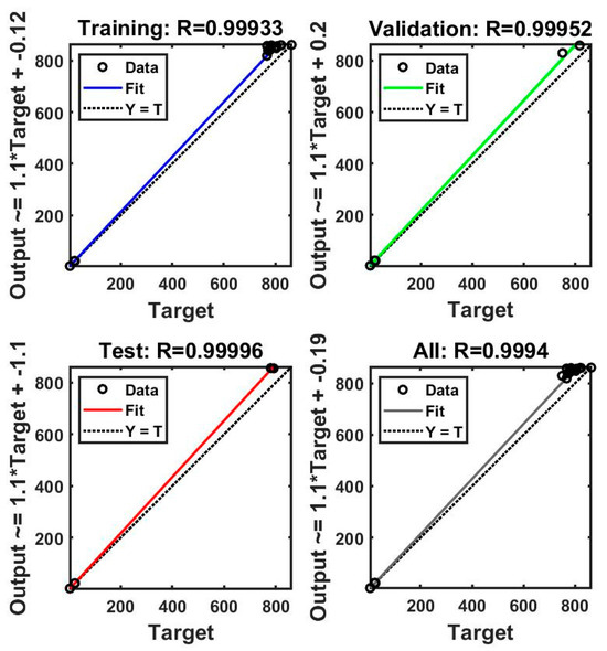 The performance of the ANN model was evaluated according to the convergence of the MSE. The best validation performance was observed after four epochs (MSE = 22). Figure 9 and Figure 10 present plots of the linear regression coefficients. As shown, the model fit the data well; the global correlation coefficients (R) in the case of PP30-F were 0.999 for training, 0.997 for testing, and 0.999 for validation, and in the case of PP30-P, they were 0.997, 0.999, and 0.999, respectively. In addition, the training, testing, and validation stages of the model for prediction were positive. This suggests that the model learned effectively, generalized well to new data, and did not overfit the training dataset. It indicates a promising performance and adds credibility to the model’s ability to make accurate predictions.