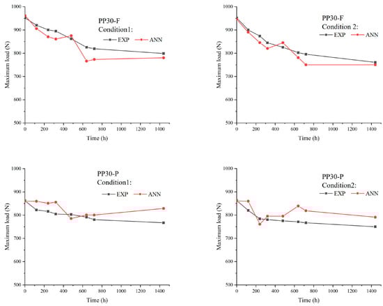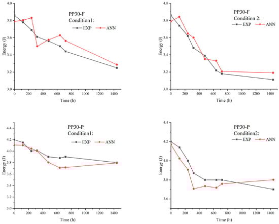 Figure 11, Figure 12 and Figure 13 present comparisons between the prediction results of the ANN model and the experimentally obtained results. Overall, the proposed model provided accurate results. The ANN results agreed well with the experimental data concerning the impact load, energy absorbed, and tensile strength, with maximum errors of 3, 5%, and 6%, respectively. However, it is important to recognize that despite the overall accuracy of our predictions, slight differences between the results of the ANN algorithm and the experimental data may appear. These deviations could arise from several factors, such as natural variations in material properties, environmental conditions during experimental testing, or even potential inaccuracies in the parameters of the algorithm itself. However, despite these minor deviations, our model is capable of accurately predicting the mechanical impact performance of aged SNFT biocomposites.