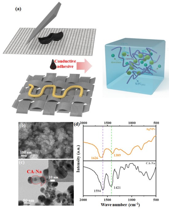 Metallic nanoparticles with high electrical conductivity and high stability, such as silver nanoparticles (AgNPs), have attracted great interest in flexible electronics [16,17,18,19]. The stable dispersion of AgNPs in various solvents makes it very easy to generate a stable conductive ink, and the AgNPs have high compatibility with polymer-based adhesives (epoxy-based, acrylic-based, polyurethane-based, etc.) [20,21,22]. Such adhesives, especially waterborne polyurethanes (WPUs), offer high flexibility and stickiness, which considerably aids in the attachment and durability of nanoparticles to the substrate [23,24]. The simplest method to fabricate flexible e-textiles is to print AgNP-based conductive coatings with WPU adhesive directly on the fabric surface. However, the printed AgNP coatings do not actually conduct electricity because the AgNP surface is absorbed by a layer of non-conductive stabilizer (sodium citrate, polyvinylpyrrolidone, cetylammonium bromide, etc.) [25]. Generally speaking, it is necessary to use the second high-temperature sintering (more than 150 °C) step to remove the surface stabilizers and sinter the material into a dense block to form a conductive network; the use of high temperatures that are not conducive to the stability of the fabric substrate will inevitably lead to shrinkage or mechanical problems in the attenuation [26,27,28]. To maintain the benefits of textile substrates, it is critical to develop a low-temperature/room temperature sintering technique for activating the conductive network of AgNPs.