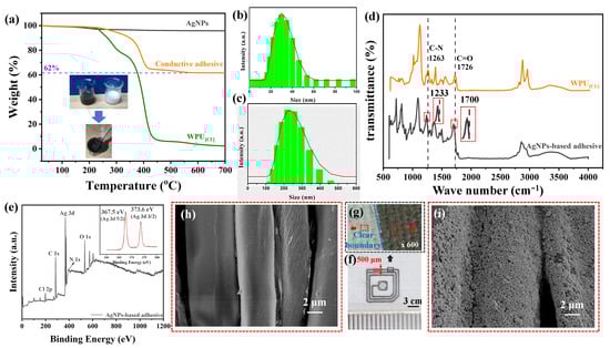 Conductive AgNP-based adhesives with different contents of AgNPs can be obtained by homogeneously mixing AgNP co-ethanol solution with WPU[Cl−]. In order to accurately test the content of AgNPs in the conductive adhesive, the TG measurement was used to estimate the content of AgNPs based on the different thermal stability values of each component in the adhesive. The TG curves of both the conductive adhesive and WPU[Cl−] exhibit sustained weight loss in the range of 100–400 °C, which is mainly due to the thermal decomposition of WPU[Cl−]. The content of the conductive adhesive can be estimated as 62 wt.% based on the difference in their weight loss (Figure 2a). On the other hand, the stability of the conductive adhesive is a guarantee of high-quality printing. Whether AgNPs can be uniformly dispersed in solution with WPU[Cl−] is a prerequisite to guarantee the stability of the conductive adhesive. In order to investigate the dispersion of the two components of the conductive adhesive, the particle size distribution of the AgNPs and WPU[Cl−] were compared (Figure 2b,c) and it was found that AgNP and WPU[Cl−] emulsions are monodisperse; their respective average particle sizes are 30 nm and 120 nm. The WPU[Cl−] molecular chain in the aqueous solution indicates the state of the threads of the entanglement; when WPU[Cl−] dispersion is mixed with alcohol, the viscosity of the WPU[Cl−] dispersion reduces and the molecular chains become loose. Since AgNPs are pre-dispersed in alcohol solvents and the particle size is smaller than that of WPU[Cl−] emulsions, AgNPs can form a homogeneous miscibility with the loose WPU[Cl−]molecular chains in alcohol solutions. To further elucidate the interaction between AgNPs and WPU[Cl−]in conductive adhesives, the FTIR of WPU[Cl−]and conductive adhesives were compared (Figure 2c). The stretching vibration attributed to C=O and C-N on the molecular chain of WPU[Cl−] is red-shifted from the original 1726 cm−1 and 1263 cm−1 to 1700 cm−1 and 1233 cm−1, respectively. This indicates that AgNPs can be dispersed more equally in WPU[Cl−]with the help of this interaction [40]. In addition, from the XPS spectra of the conductive adhesive (Figure 2e), the 3d5/2 and 3d3/2 electron-orbital binding energy of Ag in the conductive adhesive appeared at 367.5 eV and 373.6 eV, respectively, which are smaller than those of the standard Ag0 (368 eV and 374 eV), confirming the interaction between the WPU[Cl−]and the AgNPs [41].