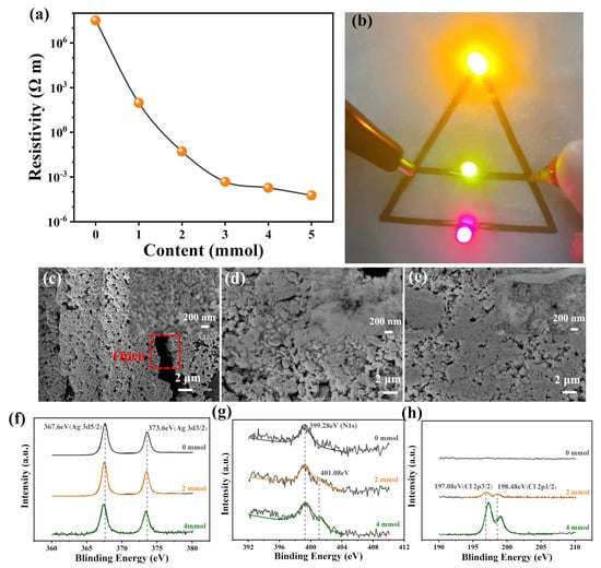 Figure 3. (a) Resistivity of as-prepared AgNP-based printed conductive coatings based on different contents of OH-IL[Cl−]-OH in WPU[Cl−]; (b) photo of printed conductive pattern based on 4 mmol of OH-IL[Cl−]-OH in a WPU[Cl−]application in conductive wire for connecting the LEDs; morphology of printed pattern based on different contents of OH-IL[Cl−]-OH in WPU[Cl−]: (c) 0 mmol, (d) 2 mmol, and (e) 4 mmol; and XPS spectra of different elements: (f) Ag 3d, (g) N 1s, and (h) Cl 2d.
