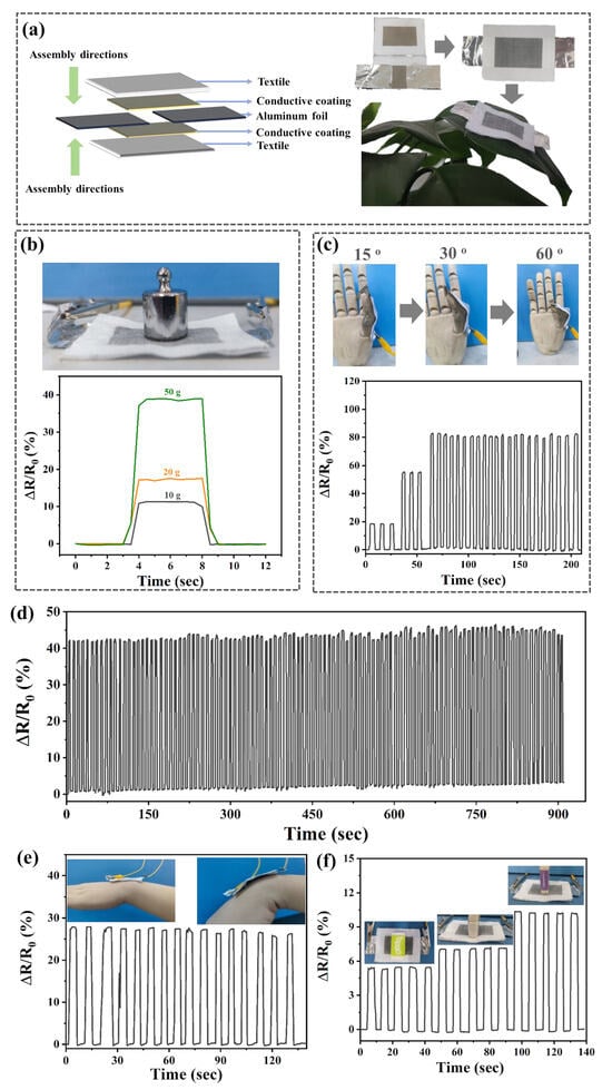 Figure 4. (a) Structure and photographs of textile pressure sensors based on AgNP-based conductive adhesive; (b) real-time resistance curve of the textile pressure sensor for detection of different weights with 10 g, 20 g, and 50 g; (c) real-time resistance curve of the PET-FPS to thumb bending; (d) stability of the PET-FPS on weight detection (50 g); (e) real-time resistance curve of PET-FPS on monitoring wrist vibration; and (f) the PET-FPS on area recognition.