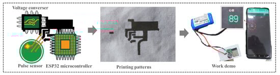 According to the regulation of OH-IL[Cl−]-OH on the conductivity of printed circuits, it is known that the minimum resistivity can be as low as 10−5 Ω m, which has the potential to be applied as a flexible conductor. We transplanted the components of a commercialized finger pulse device onto a PET textile printed with a designed flexible circuit (using 4 mmol of OH-IL[Cl−]-OH, Figure 5). The commercialized finger pulse device consists of an information acquisition module (pulse sensor, 3.3–5 V working voltage), an information processing module (ESP32 microcontroller with Bluetooth, 3.3–3.6 V working voltage), and a voltage conversion module. These components were soldered onto the printed circuit and connected in series. The 5 V power supply is first stabilized by the voltage converter module to output a voltage of 3.7 V to supply the pulse sensor and the microcontroller ESP32 for operation. The pulse sensor is responsible for collecting finger pulse data and outputting it to the microcontroller ESP32, which then collects heart rate data every 10 ms for processing and delivers it to the mobile device via Bluetooth. It was found that the designed printed circuit can successfully connect the components in series and maintain normal operation. Touching the electronic fabric connected to the pulse sensor to the fingertips, the pulse rate recorded on the mobile device was 89 bits, which is comparable to the heart rate of a healthy male of ~25 years of age. This suggests that the printed circuit has great potential for use as a flexible PCB.