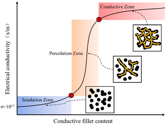 Most polymer materials have been found to have a resistivity of between 1012 and 1017 Ω·cm [3], and the addition of conductive fillers, such as CB, CNTs, and graphene, can make polymers electrically conductive; a large number of experiments and studies have demonstrated that the conductivity of polymer composites has a nonlinear relationship with the doping of conductive materials. In Figure 1, there exists a threshold value for doping of the conductive material. When the conductive filler doping is below the threshold, the conductivity of the composite material increases slowly with the increase in filler doping. However, when the doping of the conductive filler is close to the threshold, the conductivity of the material increases dramatically and changes from an insulating material to a conductive material. Subsequently, when the doping of the conductive material is further increased with yet another specific value, the electrical resistivity of the polymer composite material tends to stabilize again, and a further increase no longer significantly improves the resistivity of the material [40]. This phenomenon is known as the electrical percolation of filled polymers, and the amount of conductive material doped at the time of a sudden change in conductivity is known as the percolation threshold of the polymer composite [41].