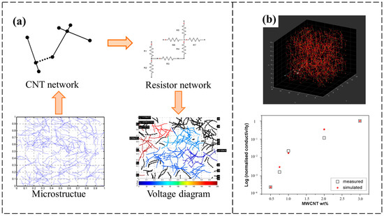 (a) Schematic diagram of the equivalent resistance calculation for the 2D model [60]; (b) cloud diagram of the CNT-filled RVE with the model and experimental conductivity results [61].
