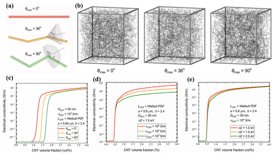 In fact, CNTs are not straight rods in the polymer matrix but rather curved segments that are intertwined with each other. Therefore, modeling CNTs as curved or folded structures can more realistically simulate the shape and structure in polymers. Taking into account the actual structure of CNTs in polymers and the simulation efficiency, Sun et al. [65] developed a CNT model with a maximum folding angle of 120°. The model uses Dijkstra’s algorithm to search the conductive network, calculates the tunneling resistance between CNTs according to the Landauer–Büttiker formula, and finally applies Kirchhoff’s law of resistance to solve the model conductivity. The model uses Dijkstra’s algorithm to search the conductive network, calculates the tunneling resistance between CNTs according to the Landauer–Büttiker formula, and finally applies Kirchhoff’s law of resistance to solve the model conductivity. The researchers verified the accuracy of the model by comparing the simulation results with the experimental results; moreover, the analysis of the model study reveals that the polymer conductivity increases with the increase in the L/D ratio of the CNTs. The effect of the degree of the CNTs’ agglomeration on the polymer conductivity changes with the change in the volume fraction of the CNTs; at lower volume fractions, the conductivity increases with an increase in the degree of agglomeration and then decreases after reaching the maximum value; at higher volume fractions, the conductivity decreases monotonically with an increase in the degree of agglomeration. Fang et al. [66] established a 3D curved CNT model based on stochastic third-order Bézier curves and investigated the effect of the degree of the CNTs’ curving on the electrical conductivity of the model. The results show that the conductivity decreases significantly with an increase in the degree of Bézier curvature, and the percolation threshold of the curved CNT model increased by approximately 20% compared with that for the straight CNTs. Doh et al. [67] investigated the effect of the degree of waviness of CNTs on the conductivity and the chance of percolation using a Monte Carlo method based on Bayesian inference. The percolation behavior of the polymer was simulated by increasing the maximum polar angle of the CNTs, and the final simulation results were in agreement with those of Fang [66]. The inhomogeneity and waviness of the length of CNTs, which are inevitably present in real CNT-filled polymers, are the two main factors that affect the electrical percolation behavior of polymers. However, these two factors have rarely been considered simultaneously in the previous models. Wang et al. [68], on the basis of an existing model and considering both the length inhomogeneity and the waviness of CNTs, developed a new numerical model (Figure 3a,b). The model describes the length inhomogeneity of CNTs in terms of the Weibull distribution, and a segmented sequence of several line segments was used to simulate the curved CNTs. It was found that the polymer’s electrical percolation behavior depended mainly on the geometry and shape of the filler rather than the intrinsic conductivity of the filler or the potential barrier of the polymer; the percolation threshold decreased significantly as the length inhomogeneity of the CNTs increased or the degree of waviness decreased. Specific results are shown in Figure 3c–e.