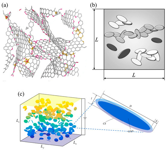In polymer systems, graphene fillers tend to exist in the form of lamellar stacks with irregular polygonal shapes along with some folds. Mathioudakis et al. [107] constructed a real graphene model using the Monte Carlo method to simulate and theoretically investigate the structural, mechanical, and optoelectronic properties of three-dimensional graphene fillers. As shown in Figure 5a, although all of the properties are closer to the real graphene material, the model is too complicated and is not favored by researchers. In contrast, researchers tend to approximate graphene models as simpler disks or rectangular plates. In Figure 5b, Oskouyi et al. [108] constructed a three-dimensional Monte Carlo model by modeling graphene as a disk added to the RVE and investigated the effect of an external electric field voltage on the electrical conductivity of the polymer composite. The results showed that the resistivity of the polymer composites decreased nonlinearly with the increase in the applied voltage, whereas the extent of the nonlinear behavior decreased with increasing filler volume fraction. Zabihi et al. [109] constructed a Monte Carlo model of graphene/PMMA polymer by modeling graphene as a disk and combining it with the Landauer–Büttiker resistance formula. The study of the model revealed that the tunneling resistance between graphene and the metal is several orders of magnitude larger than the intrinsic resistance. The percolation threshold decreased with the increase in the tunneling distance and increasing graphene diameter. The dispersion of graphene perpendicular to the direction of the electric field causes the polymer to exhibit the smallest conductivity and the largest percolation threshold. In addition, Fang et al. [110] proposed a Monte Carlo model to calculate the conductivity of graphene-filled polymers using the equipotential approximation. The graphene model has coated surfaces (CSs) (Figure 5c), and the potential of the CSs can be derived from the graphene potential using the walk-on-spheres (WoS) method to obtain the potentials of all of the linked graphene, and it was demonstrated that the conductivity and percolation thresholds obtained by this model are in good agreement with the experimental data.