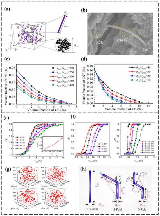 (a) Schematic of CB and CNT model filled RVE, (b) SEM images of CB and CNTs in polymer, (c) Dependence of synergistic effect on the L/D ratio of CNTs, (d) Dependence of synergistic effect on CB to CNTs’ diameter ratio [122], (e) Effect of the degree of CB agglomeration on the percolation behavior, (f) Distribution of CB in the RVE when the degree of agglomeration is set to 0, 50, 100 and 150, (g) Effect of fold angle and number of fold segments on polymer percolation behavior, (h) Schematic diagrams of rod and folded CNTs [124].