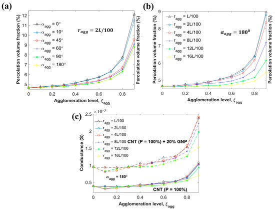 (a) Effect of agglomeration radius of CNTs on percolation threshold, (b) Effect of agglomeration angle of CNTs on percolation threshold, (c) Effect of addition of graphene on electrical conductivity of CNT-filled CPCs in agglomerated state [127].