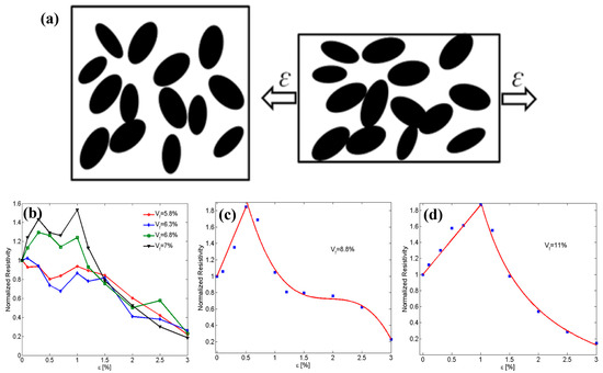For the piezoresistive modeling of graphene-filled polymers, Oskouyi et al. [138] determined the new position and orientation of graphene in the deformed matrix (for uniaxial tensile strains) using affine transformations in their model, assuming that the polymers are subjected to mechanical strains by neglecting the folding and curving deformation of graphene (Figure 10a). In this research, Monte Carlo simulation computational code using the FORTRAN language was developed and ran on a Linux cluster. The volume fraction of filler was found to be an important factor affecting the piezoresistive behavior, and the polymer’s piezoresistive behavior was unstable at low graphene volume fractions. The polymer’s piezoresistivity was approximately linearly correlated with the strain as the graphene volume fraction increased until the critical strain, at which the resistivity behavior changed and the resistivity exhibited a monotonically decreasing trend as the strain continued to increase. Furthermore, the critical strain value increased with the increase in the filler volume fraction (Figure 10b–d). Yang et al. [139] found that the piezoresistive properties of graphene–rubber composites had a linear response at the initial stage of the strain and exhibited nonlinear characteristics as the strain increased. The model calculated the piezoresistive response of compounds containing 2.3% and 3.0% (wt.%) graphene, which is in good agreement with the experimental results.