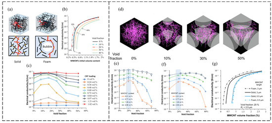 (a) Monte Carlo model of foamed polymer and schematic diagram of its conductive pathways; (b) variation in the conductivity with the volume fraction of the CNTs at different void fractions; (c) variation in the conductivity with the void fraction for the different CNT additions [149]; (d) simulated images of CNT networks in polymer foams at 0%, 10%, 30%, and 50% void fractions; (e,f) conductivity results for different volume fractions of CNT-filled foamed polymers at different void fractions; (e) model predictions; (f) experiments; (g) effect of CNT length on the conductivity of foamed polymers with a constant porosity, β, and bubble radius, Rc [150].