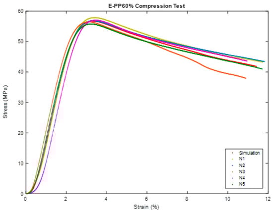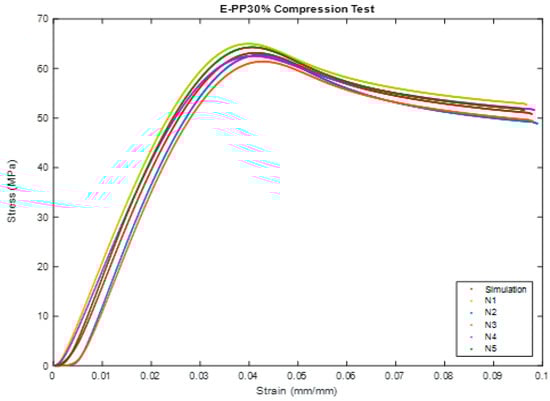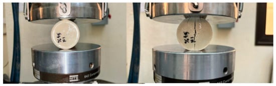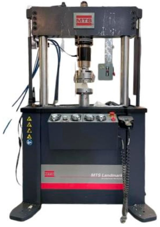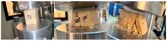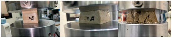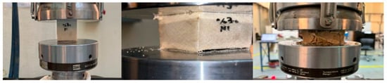 We keep applying more and more pressure until either the material cannot take it anymore, or it reaches its maximum strength. This helps us figure out important things about the material, like how strong it is, how stiff it behaves, and how it deforms under pressure. During the test, we measure the load (the force we are applying) and how much the material squishes or deforms. All these data help us create a stress–strain curve, which is like a roadmap showing how the material handles stress until it eventually gives in. The highest point on this curve is like the material’s superhero moment—it is the maximum compressive strength, showing us the highest stress, its cross-sectional area. In our recent experiment, we took some cube-shaped samples out of their molds after three days. These cubes were then put through the compression test. Taking them out of the molds and the whole curing process went smoothly, no hiccups there. The machine in Figure 1 used is of type MTS-Landmark 810 universal testing machine, Eden Prairie, MN, USA. We placed these cubes in a universal testing machine (UTM), and applied pressure at a steady speed of (1 mm/min). It was like a slow-motion showdown as we watched to see how these cubes handled the pressure until they could not take it anymore according to ASTM D695 []. After the test, we crunched the numbers to understand the material’s strength and behavior under all that squeezing. Typically, specimens are squeezed between flat hardened steel plates during compression testing. The stress–strain curve obtained is similar to that of tensile tests, and the same “toe region” and stress and strain criteria apply.