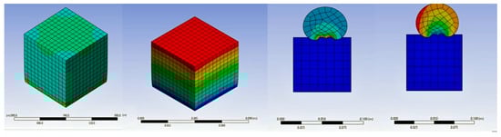 The utilization of the ANSYS 2023 R1 software program in this study underscores its exceptional capability to optimize a wide range of features, encompassing everything from boundary conditions to the design of geometric elements []. ANSYS stands out as an incredibly versatile tool that seamlessly integrates diverse physics to facilitate comprehensive analyses. In the specific context of this research, the primary software employed for simulation-driven design was the ANSYS 2023 R1 Discovery software, which proved to be of utmost importance in unraveling the complexities associated with the behavior of eco-friendly plaster. The initial phase of the investigation focused on establishing boundary conditions through the meticulous execution of dynamic explicit/implicit tensile and compression tests. These tests were meticulously performed on cylindrical and cubic samples, each of which was subjected to varying mixing ratios of 30%, 45%, and 60%. The dynamic nature of the testing procedure facilitated a thorough exploration of the response of the material under different conditions, thereby providing invaluable insights into its mechanical properties. Once the tests were completed, the results were carefully extracted and rigorously compared with those obtained from experimental samples. This comparative analysis played a crucial role in validating the accuracy and reliability of the ANSYS simulation, by juxtaposing the simulated outcomes with real-world experimental data, a deeper understanding of the performance of Mixture under diverse scenarios was achieved. The ANSYS Discovery software emerged as a pivotal tool in this study, seamlessly integrating interactive geometry modeling, high-fidelity simulation, and real-time physics simulation. Its user-friendly interface facilitated a streamlined workflow, enabling efficient analysis and design processes [,]. The simulation-driven approach not only expanded the study but also provided a comprehensive platform for evaluating the behavior of Mixture in a variety of scenarios. The integration of simulation into the research methodology allowed for a detailed examination of the material’s response to different conditions, thus enhancing the overall accuracy of the study. The comparison between experimental curves and simulated results provided valuable insights into the predictive capabilities of the ANSYS software, enabling us to draw more precise conclusions about the mechanical characteristics of Mixture. In conclusion, the ANSYS software program Discovery played a pivotal role in this study, providing a comprehensive solution for simulation-driven design. By combining interactive modeling with high-fidelity simulation, a thorough analysis of the behavior of Mixture was facilitated. The ANSYS program employs specific inputs and compares product behavior to physics. The ANSYS software program Discovery was the primary simulation-driven layout tool used in this investigation. A dynamic explicit/implicit approach was used to establish the boundary conditions, with a fixed support at the bottom of the sample and a displacement support at the top of the plaster samples, as illustrated in Figure 2. The integration of simulation into the research methodology not only validated the accuracy of the ANSYS software but also contributed to a more nuanced understanding of the material’s performance in various scenarios, thereby laying the foundation for future advancements in Mixture construction materials (See Figure 2).