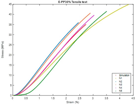 Comparison between Simulation and Closest Sample of BSCO Plaster 30% in Tensile.