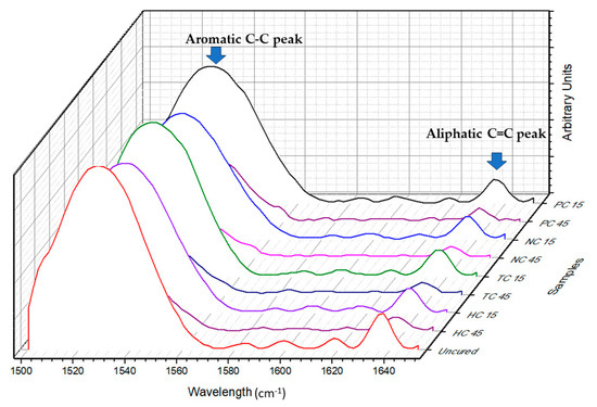 FTIR spectra from 1500 cm−1 to 1650 cm−1 for all tested groups compared with uncured baseline.