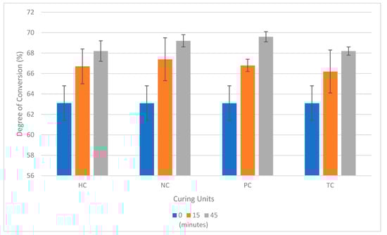 The mean values for the degree of conversion and their standard deviations are graphically represented in Figure 2. The values for 0 min were calculated by measuring the degree of conversion on the samples straight from the printer that did not undergo any post-curing for use as a baseline reference. Phrozen Cure V2 had the highest overall mean degree of conversion (69.6%) with a 45 min curing time. The Triad® 2000 VLC Curing Unit had the lowest mean degree of conversion value at the 15 min interval (66.2%) and the lowest mean degree of conversion at the 45 min interval with the homemade curing unit (68.2%).