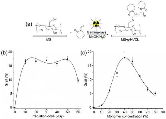 (a) Illustration of gamma ray-induced graft polymerization. (b) Grafting percentage versus irradiation dose with a monomer concentration of 50 g/v %. (c) Grafting percentage versus monomer concentration at an irradiation dose of 20 kGy.