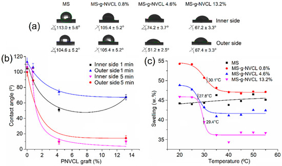 The hydrophilic properties and thermal responsiveness of MS-g-NVCL membranes were evaluated by measuring the contact angle and water swelling at various temperatures. Contact angles were determined on both sides of the membranes at 25 °C, revealing comparable hydrophilicity to pristine membranes (MS) (Figure 2a,b).