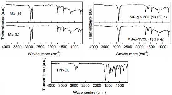 FTIR-ATR spectra of both sides of the MS and MS-g-NVCL (13.2 %) membranes, and PNVCL obtained by gamma rays. Samples labeled with (a) and (b) are the inner and outer side, respectively.