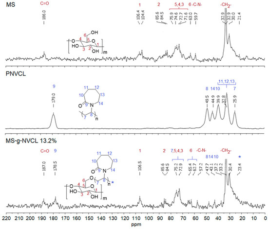 CP-MAS 13C-NMR spectra of MS, PNVCL homopolymer, and MS-g-NVCL (13.2%) membranes. C-*, polymer aliphatic chain carbon.