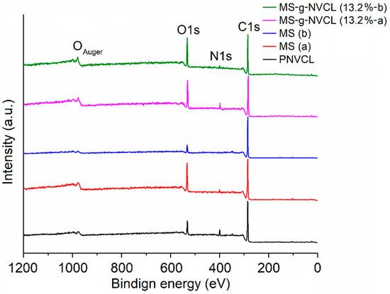 The C1s spectrum of PNVCL exhibited three distinct peaks: C=O, C–N, and C–C. Simultaneously, the O1s spectrum featured two peaks: C=O and –OH, corresponding to the oxygen of the carbonyl group and the oxygen from water molecules enclosed in the polymer. In contrast, the spectra of MS and MS-g-NVCL membranes were resolved into five peaks: C=O, C–O–C, C–OH, C–N, and C–C. Notably, there was an increase in the C–N peak in the MS-g-NVCL membranes, rising from an average of 8.6% to 15.1%. Furthermore, the O1s spectra displayed three deconvolution peaks assigned to C–O–C, –OH, and C=O. These findings imply a reduction in the peak associated with –OH, indicating that grafting primarily occurred on the –CH2–OH segment derived from cellulose, along with backbone cleavage of cellulose [19,33]. Lastly, the N1s spectrum revealed a central binding energy level at 399.83 eV (Figure 6 and Table 1).