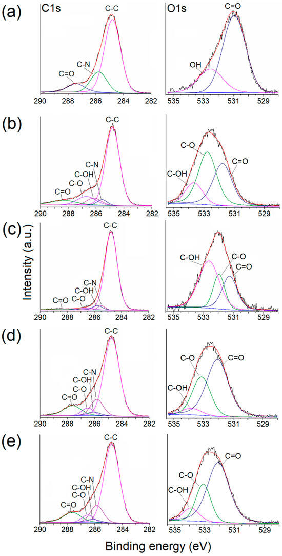 Deconvolution of XPS spectra corresponding to C1s and O1s of (a) PNVCL and (b) and (c) the inner and outer side of the MS membrane; (d) and (e) correspond to the inner and outer side of the MS-g-NVCL (13.2%) membrane, respectively.