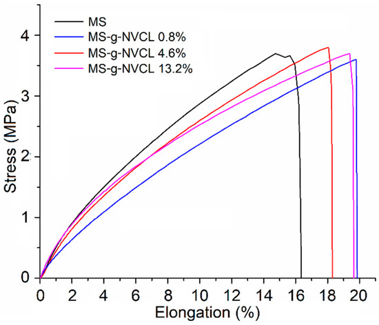 Tensile stress–strain curves of MS and MS-g-NVCL membranes with different graft percentages.