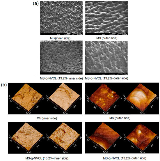 (a) SEM and (b) AFM images of MS and MS-g-NVCL (13.2%) membranes with different magnifications of the inner and outer sides.