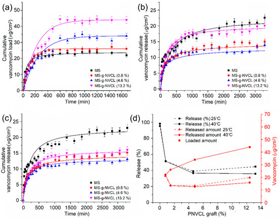 Kinetics of (a) loading of vancomycin at 25 °C, (b) release of vancomycin at 25 °C, (c) release of vancomycin at 40 °C, and (d) percentage and amount of drug released versus graft percentage of PNVCL at 3060 min.