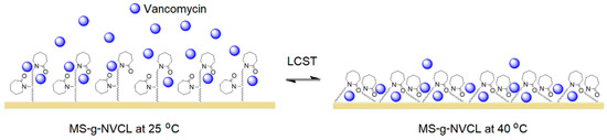 Illustration depicting the influence of the LCST of PNVCL graft on the release of vancomycin.