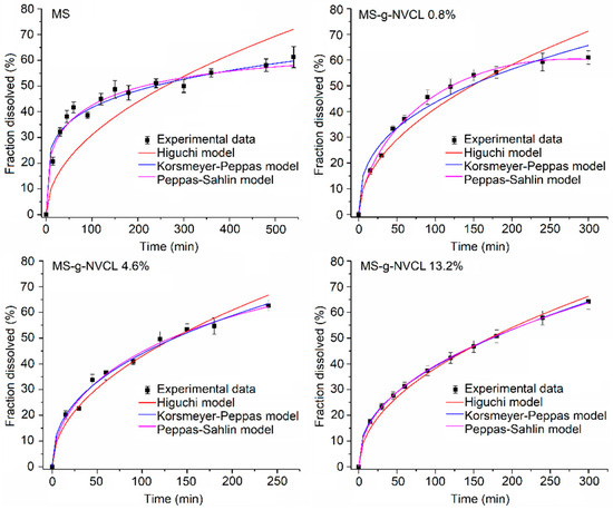 Furthermore, the drug release kinetics from both the MS and MS-g-NVCL membranes were analyzed using various representative mathematical models [38,39,40,41], as described by the following Equations (4)–(6):