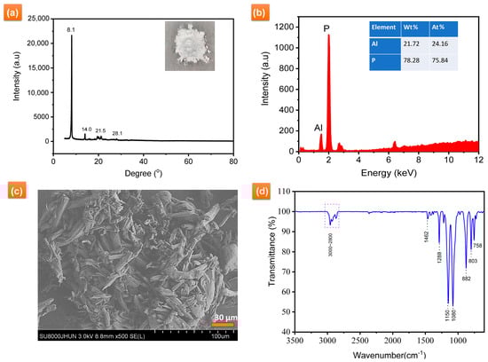 Figure 1a presents the XRD spectrum of AiBMP. There are peaks at delta 8.1°, 14.0°, 21.5° and 28°, indicating how AiBMP exhibits a crystal structure. The composition of AiBMP was further analyzed with XRF, as shown in Figure 1b. Al is 21.72 wt%, and P is 72.28 wt%; the atomic ratio of P to Al is 3.13:1 (the calculated value is 3:1).