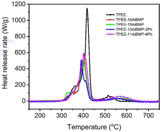 Figure 2 shows the heat release rate variation in samples with temperatures investigated with MCC. Data such as the peak of the heat release rate (PHRR), the temperature of PHRR (TPHRR), and the total heat release (THR) are presented in Table 2. Adding AiBMP reduces the PHRR and THR of the TPEE greatly. For instance, the PHRR and THR values of TPEE-15AiBMP were reduced by 55.5% and 14.57%, respectively, compared to the TPEE. In addition, the TPHRR of TPEE containing AiBMP shifted slightly to a lower temperature due to the catalytic effect of AiBMP. When the total filler loading was kept at 15 wt%, the AiBMP was partially replaced with phenolphthalein; the PHRR, THR and TPHRR of TPEE-13AiBMP-2Ph was close to that of TPEE-15AiBMP, while the THR and PHRR of TPEE-11AiBMP-4Ph increased to 23.9 kJ/g and 591.9 W/g, respectively. The above results indicate that phenolphthalein shows a negative effect on the heat release of TPEE at a high dosage (4 wt%).