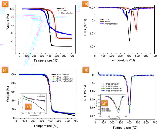 (a) TG and (b) DTG curves of TPEE, phenolphthalein and AiBMP in N2. (c) TG and (d) DTG curves of TPEE composites in N2. (c′) TG curves of TPEE composites between 500–700 °C in N2, (d′) DTG curves of TPEE composites between 300–450 °C in N2.