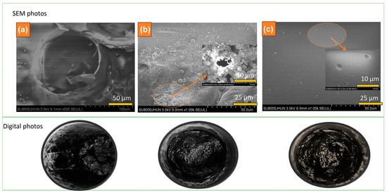 SEM (upper) and digital photos (bottom) of the residues TPEE (a), TPEE-15AiBMP (b) and TPEE-13AiBMP-2Ph (c) obtained by heating samples at 500 °C for 5 min.
