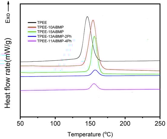 Figure 5 shows the heating and later cooling of the samples recorded using DSC. The crystallization temperature (Tc) and enthalpy (ΔHc) during cooling are listed in Table 4. The Tc of TPEE is 145 °C, and the Tc of TPEE/AiBMP composites moves to around 155 °C. The reason for this is that the AiBMP particles function as a nucleation agent to inhibit super-cooling; later, the chain-folding occurs at a higher temperature.