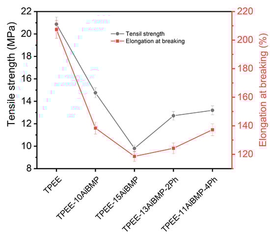 The tensile properties of TPEE composites are shown in Figure 6, The tensile strength and elongation at breaking both decrease with increasing the loading of AiMBP and then increase with the addition of phenolphthalein. For instance, the tensile strength and elongation at break of TPEE-15AiBMP were reduced by 53.0% and 42.8%, respectively, compared to the TPEE. Similar results were reported in a previous study. The reason corresponds to the poor compatibility between TPEE and AiBMP, leading to discontinuities at the particle/matrix interface.
