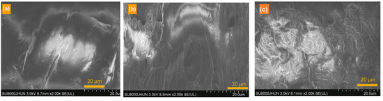 SEM images of fractured surface for TPEE (a), TPEE-15AiBMP (b) and TPEE-13AiBMP-2Ph (c).