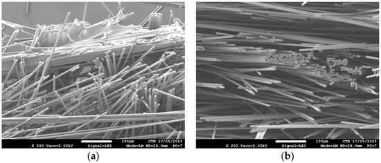 An SEM analysis of the composite’s cross sections was also performed to investigate the effect of the fiber treatment on the adhesion between the fiber and polymer matrix (Figure 7). Figure 7a is the SEM image of the non-resized PA6 composite (no-sizing PA) and 7b is a SEM image of the resized PA6 composite with the highest ILLS strength in the 0° direction (COM 4). In general, the SEM images are similar. Only in some small places can more cracks be found in the untreated composites, which could indicate slightly less fiber–matrix adhesion. Figure 6c is a SEM image of the PP composite without sizing. It can be observed that the fibers are just covered with some matrix, but there is no bonding, resulting in poor fiber–matrix adhesion. This is much better after pretreatment, and it can even be observed that pulled-out fibers during breaking still contain some polymer matrix (Figure 7d). So, the SEM analysis confirms the tensile and interlaminar shear test results. Only small differences for the PA6 composites, but clear differences for the PP composites, were found.