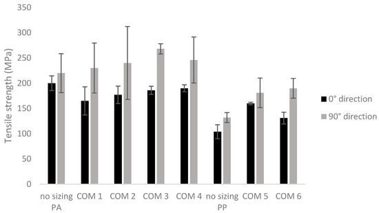 Tensile strength of carbon/PA6 and carbon/PP composites containing different fiber sizings. In black are the results obtained in the 0° direction and in gray are the results obtained in the 90° direction of the composite plate.
